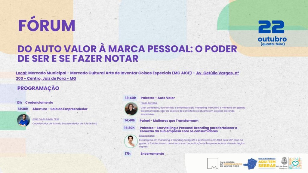 Fórum “Do Auto Valor à Marca Pessoal: o Poder de Ser e se Fazer Notar” acontece no dia 22 de outubro em Juiz de Fora
